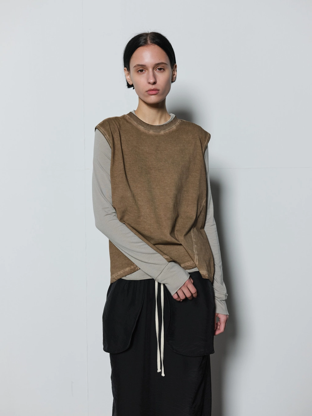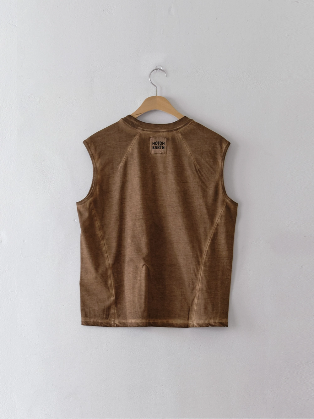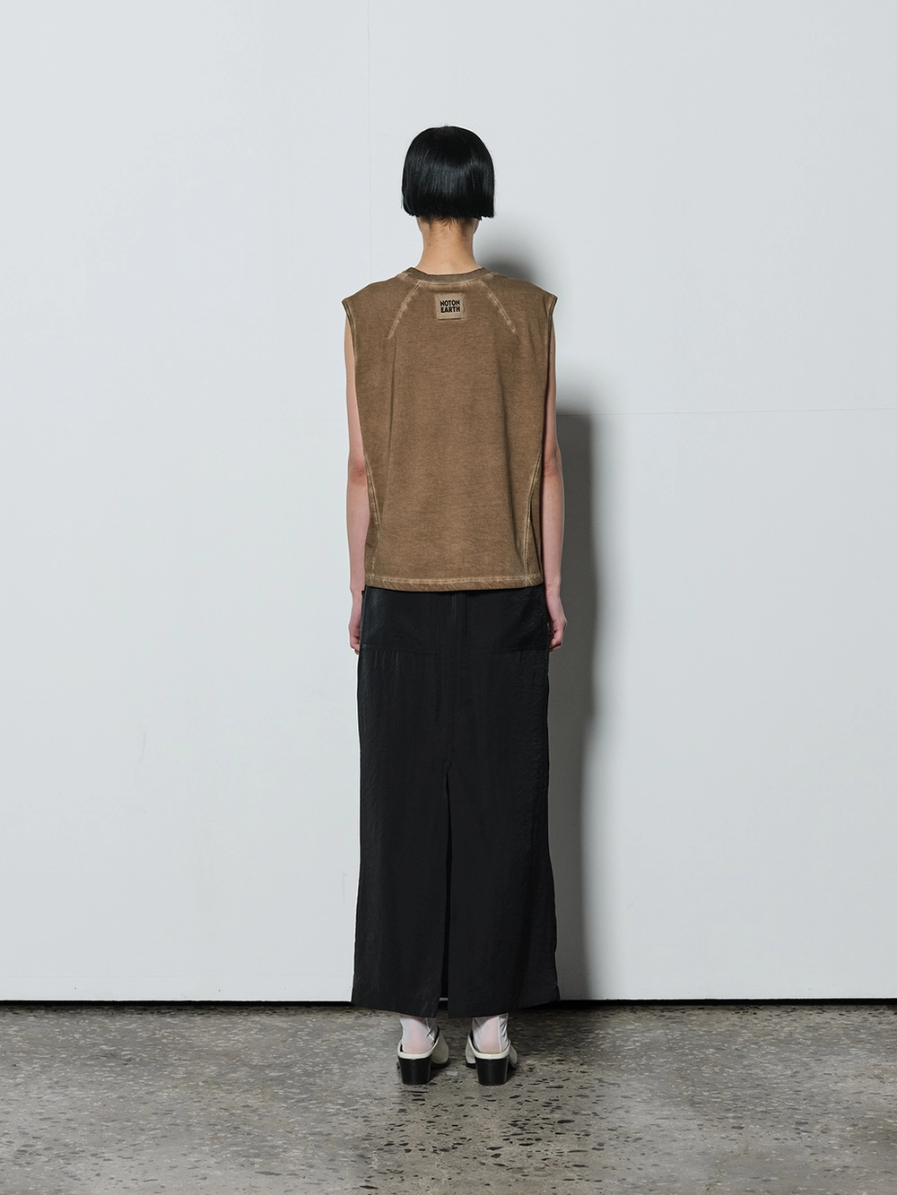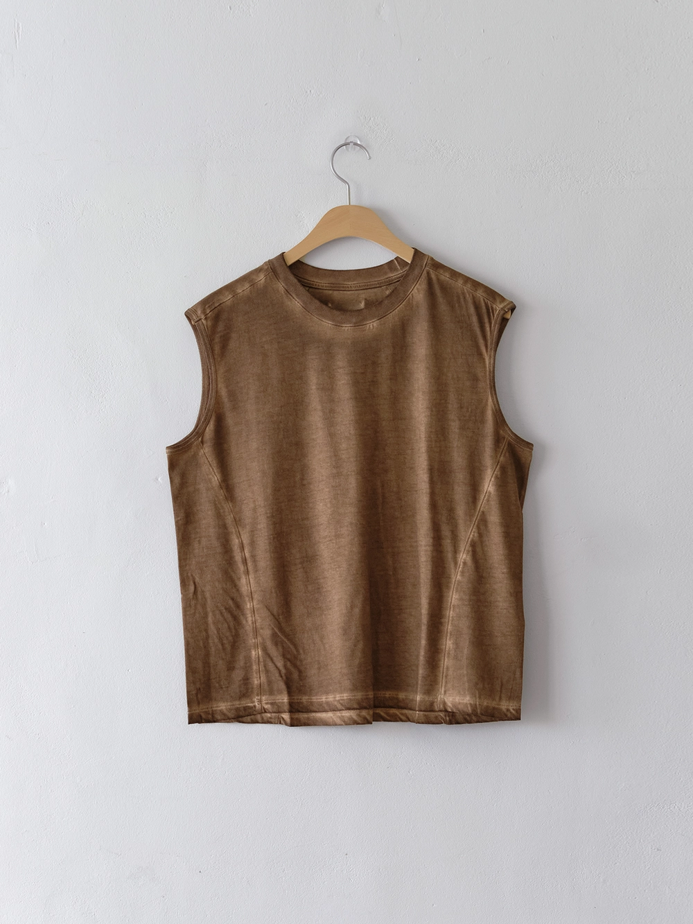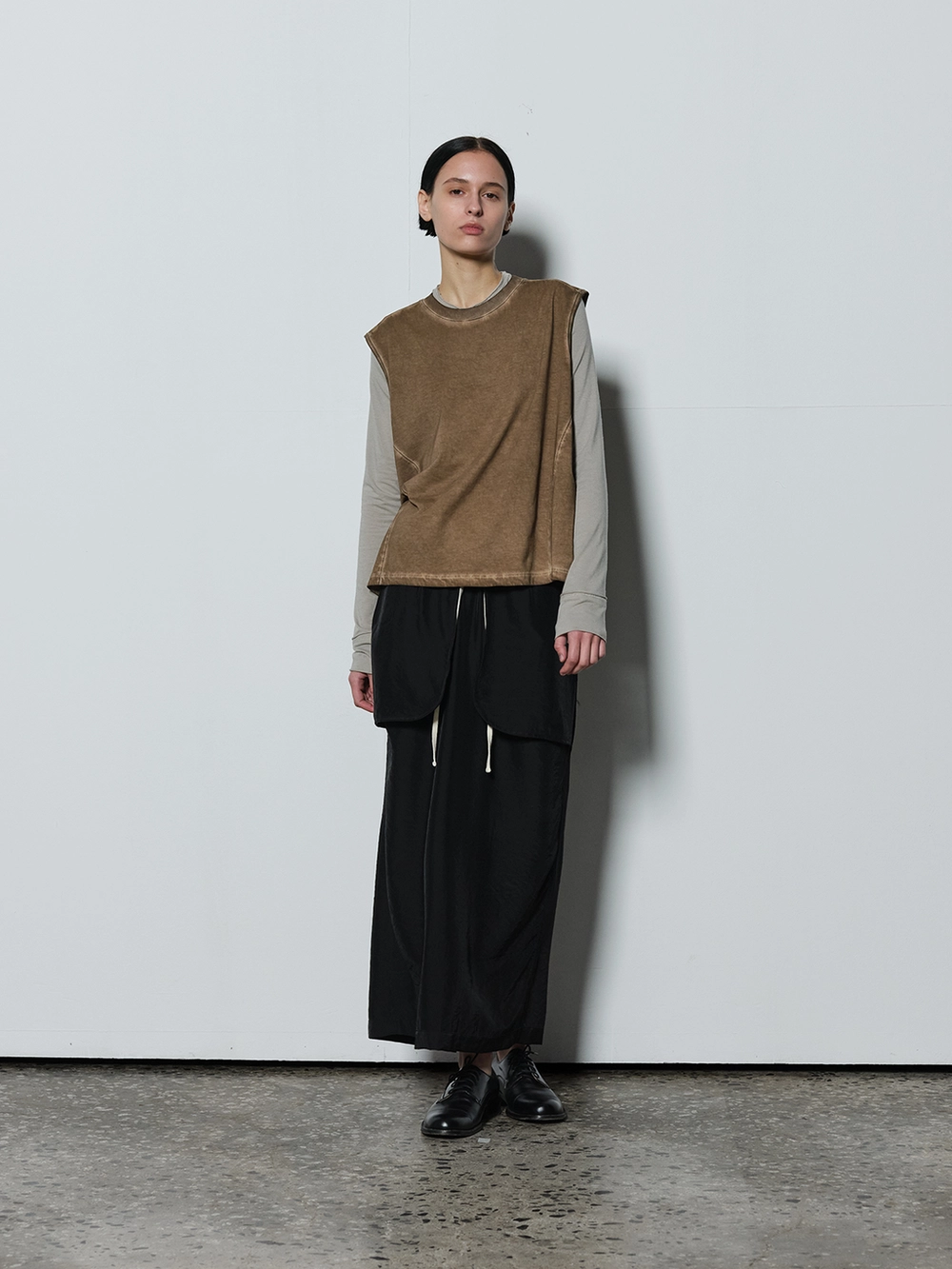At the heart of the NOT ON EARTH Laboratory is a large training center in the form of a gym. The most striking feature here is the glossy wood floor. The trainers who work in the training center typically wear activewear, but sometimes they opt for a comfortable t-shirt and pants, often going barefoot. People began calling this t-shirt the Floor T-shirt, as it complements the training center’s floor so well. Designed with a slightly shorter length and a wider fit for ease of movement, this t-shirt is made from a structured pattern that gives it a three-dimensional silhouette. Delicate topstitching is applied to all the lines, including the darts on both sides of the back neck and the seams on the sides. It is made from a soft, cool-touch cotton fabric.