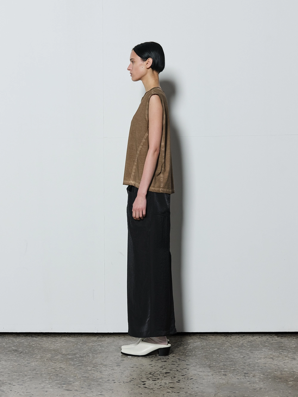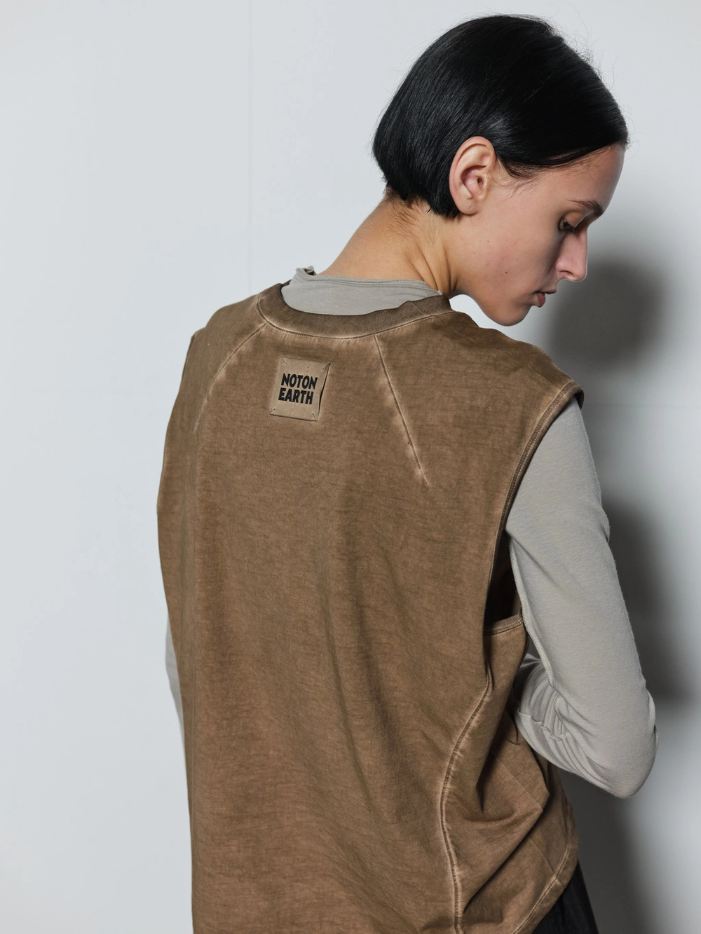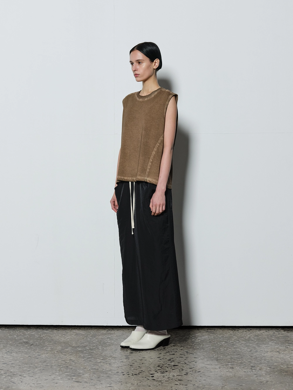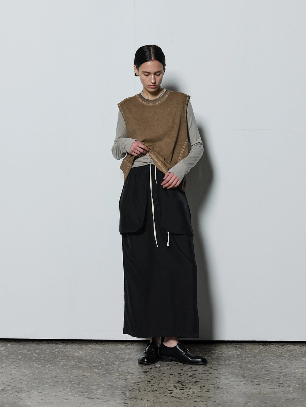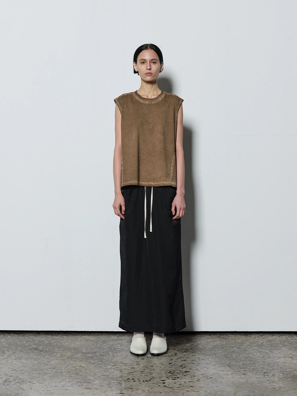 At the heart of the NOT ON EARTH Laboratory is a large training center in the form of a gym. The most striking feature here is the glossy wood floor. The trainers who work in the training center typically wear activewear, but sometimes they opt for a comfortable t-shirt and pants, often going barefoot. People began calling this t-shirt the Floor T-shirt, as it complements the training center’s floor so well. Designed with a slightly shorter length and a wider fit for ease of movement, this t-shirt is made from a structured pattern that gives it a three-dimensional silhouette. Delicate topstitching is applied to all the lines, including the darts on both sides of the back neck and the seams on the sides. It is made from a soft, cool-touch cotton fabric.