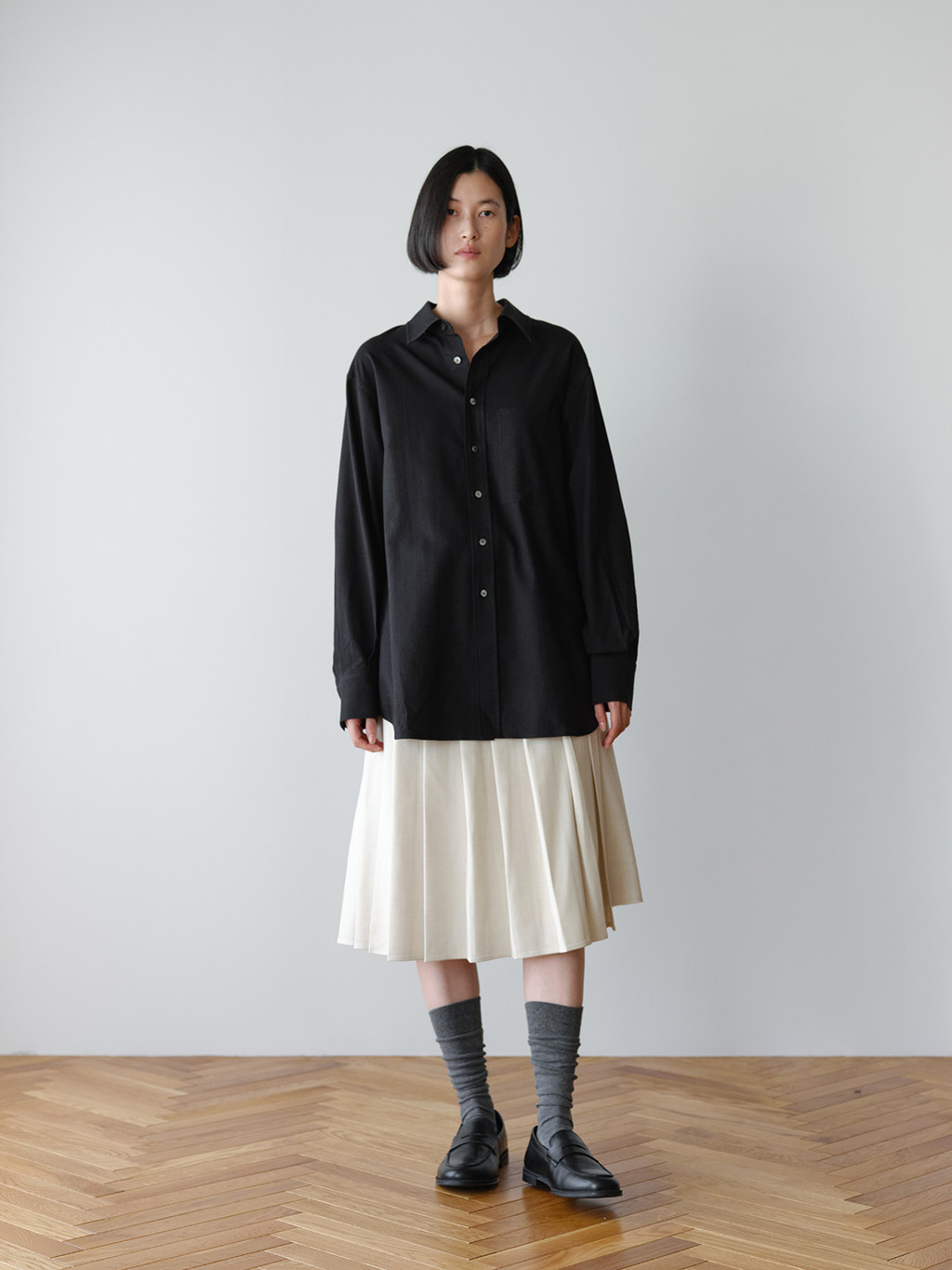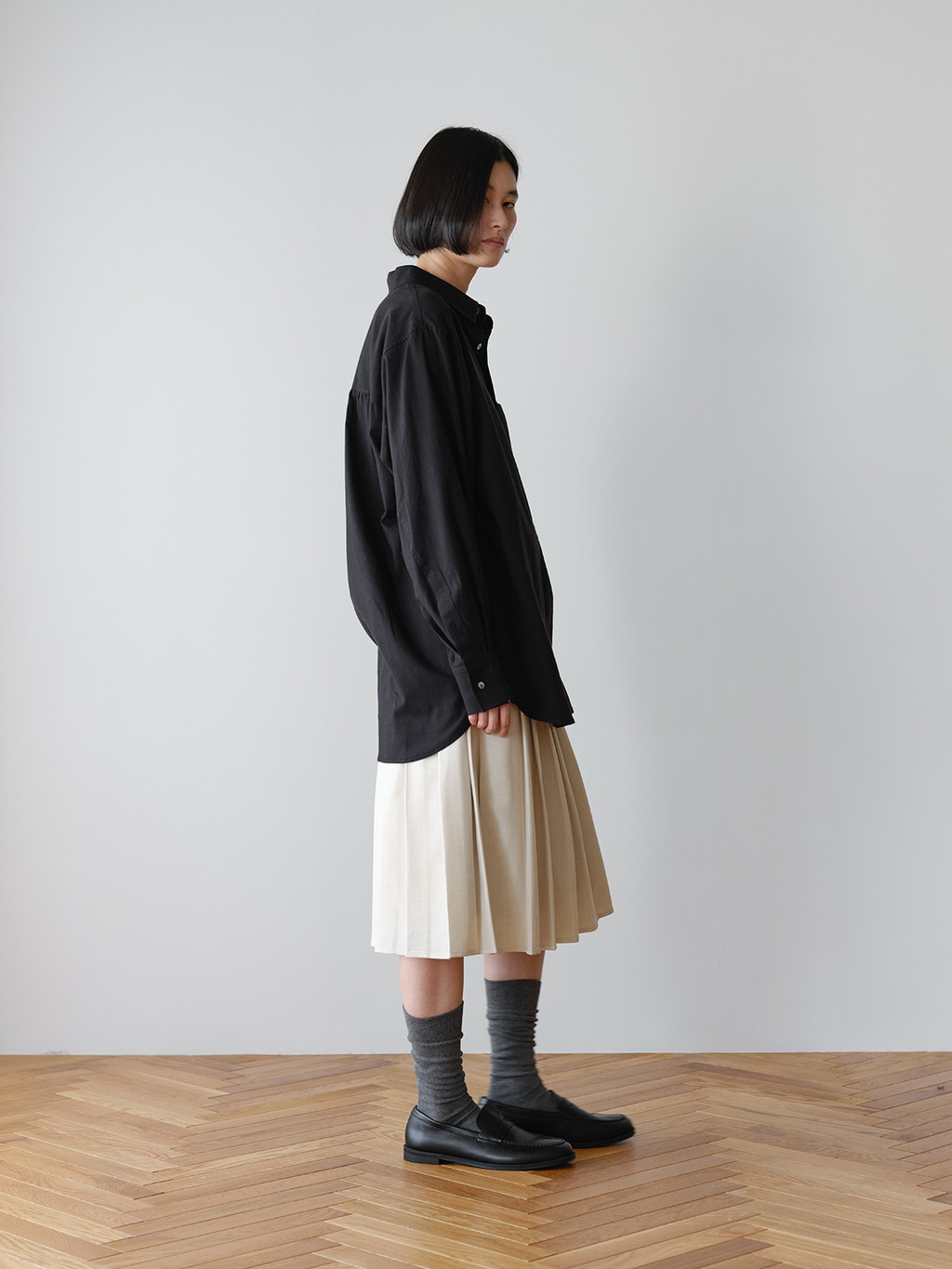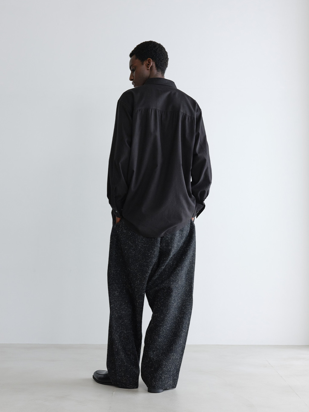 In the NOT ON EARTH Laboratory’s Archive Center, there is a high-ceilinged room filled with cabinets. This is a place where everything, from old to the most recent materials, is carefully and neatly managed. The shirts worn by the neatly dressed cabinet boys working here are called Cabinet Shirts. This is a Cabinet Shirt that reflects the delicate and minimalist aesthetic unique to the Archive Center. The difference in front and back length, the raglan sleeves cut into three panels with seam lines, and the yoke seam lines all create a three-dimensional, structured silhouette. Made from high-density cotton with a crisp touch, it is not see-through and can be worn in most seasons.
