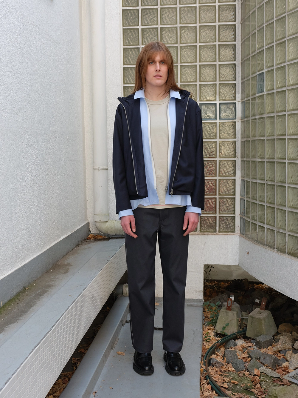 In the west wing of the NOT ON EARTH Laboratory, there is an old main lab surrounded by glass on all sides. We call this the Glass Room. Most of the agents working here are senior agents who have been with the lab for as long as the lab’s history itself. At some point, people began referring to the coats they wear as the Glass Room Coat. This coat features a relaxed silhouette and comfortable shoulder lines, with a subtle and unique tone of color and a pleasantly crisp texture. The long back slit and the NOT ON EARTH signature print patch on the lining add an artistic touch to the coat.