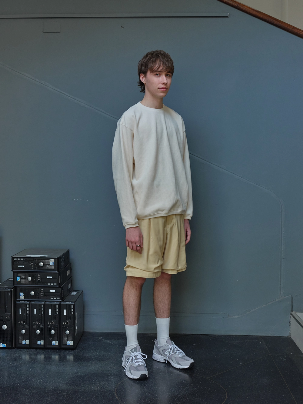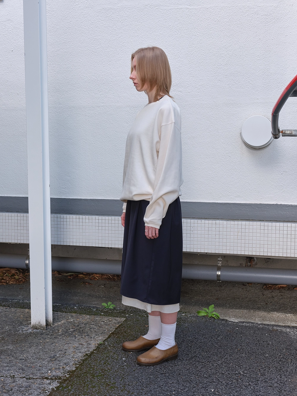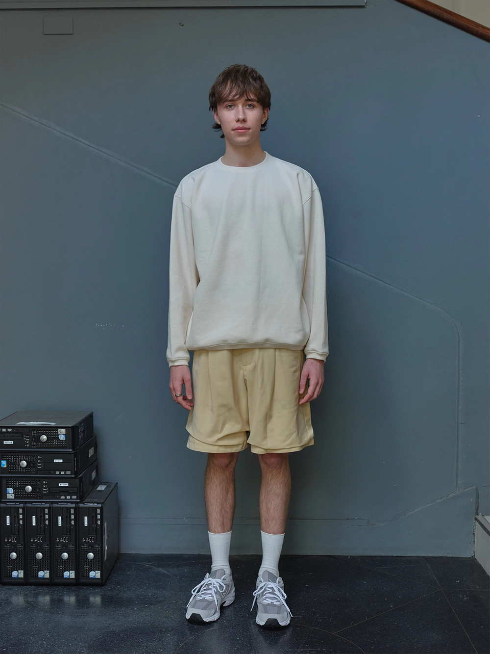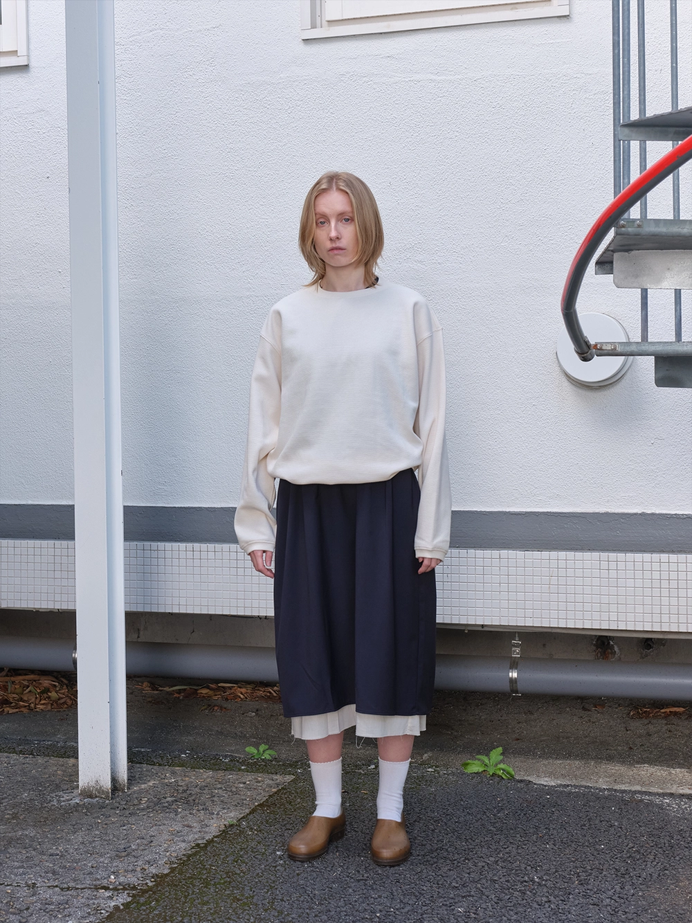 At the heart of the NOT ON EARTH Laboratory is a large training center in the form of a gym. The most striking feature here is the glossy wood floor. The trainers who work in the training center typically wear activewear, but sometimes they opt for a comfortable t-shirt and pants, often going barefoot. People began calling this t-shirt the Floor T-shirt, as it complements the training center’s floor so well. Designed with a slightly shorter length and a wider fit for ease of movement, this t-shirt is made from a structured pattern that gives it a three-dimensional silhouette. Delicate topstitching is applied to all the lines, including the darts on both sides of the back neck and the seams on the sides. It is made from a soft, cool-touch cotton fabric.