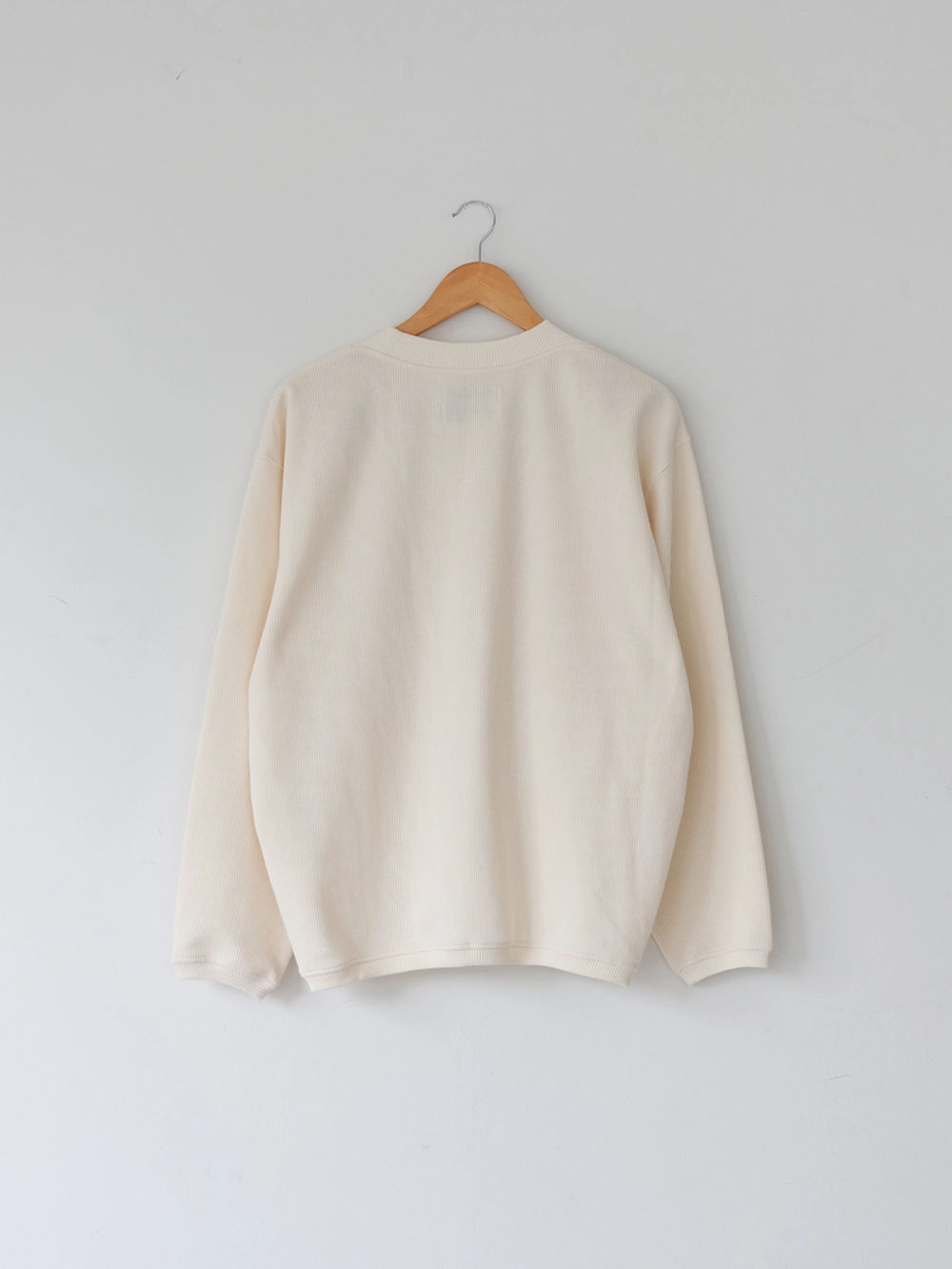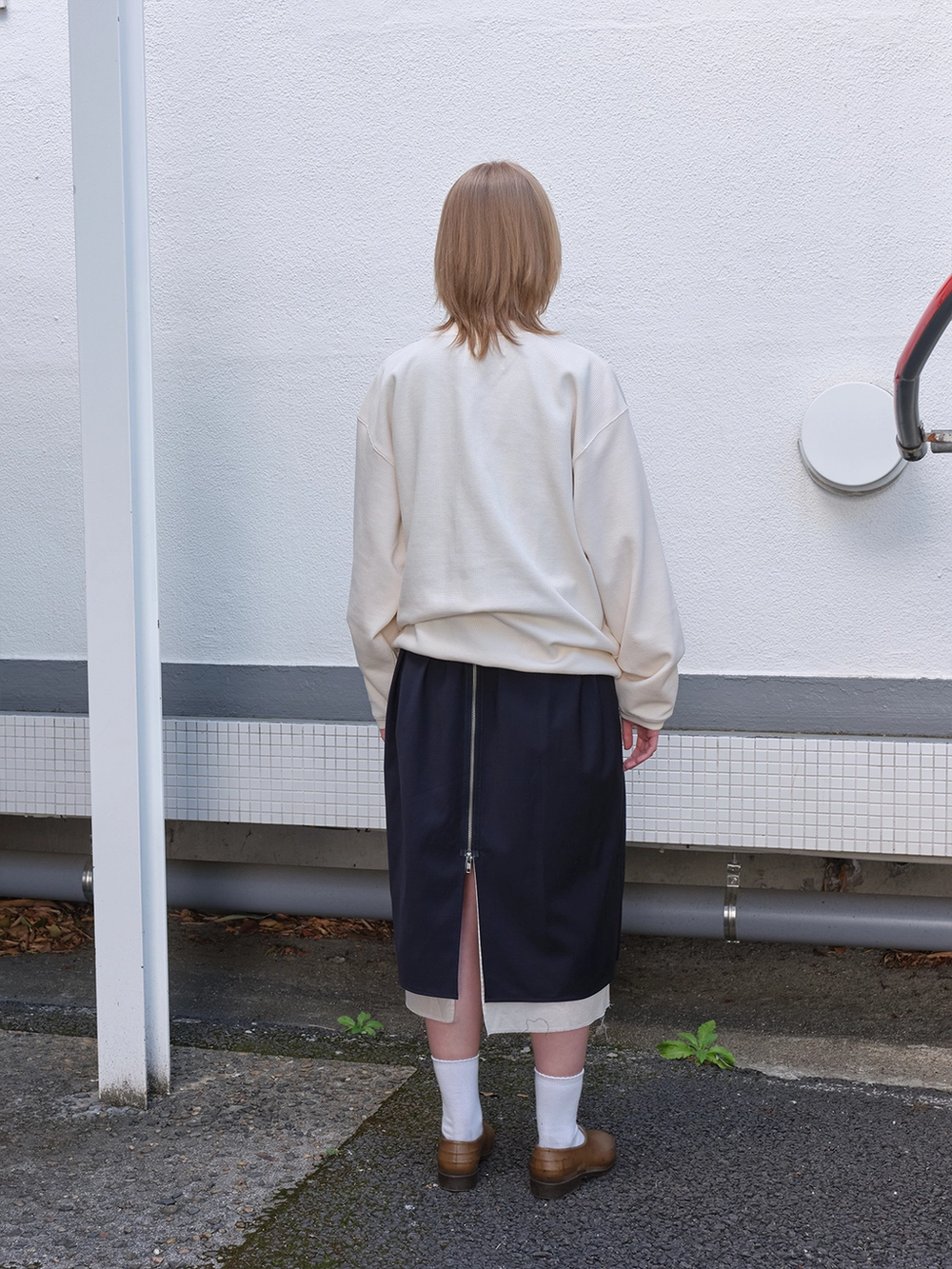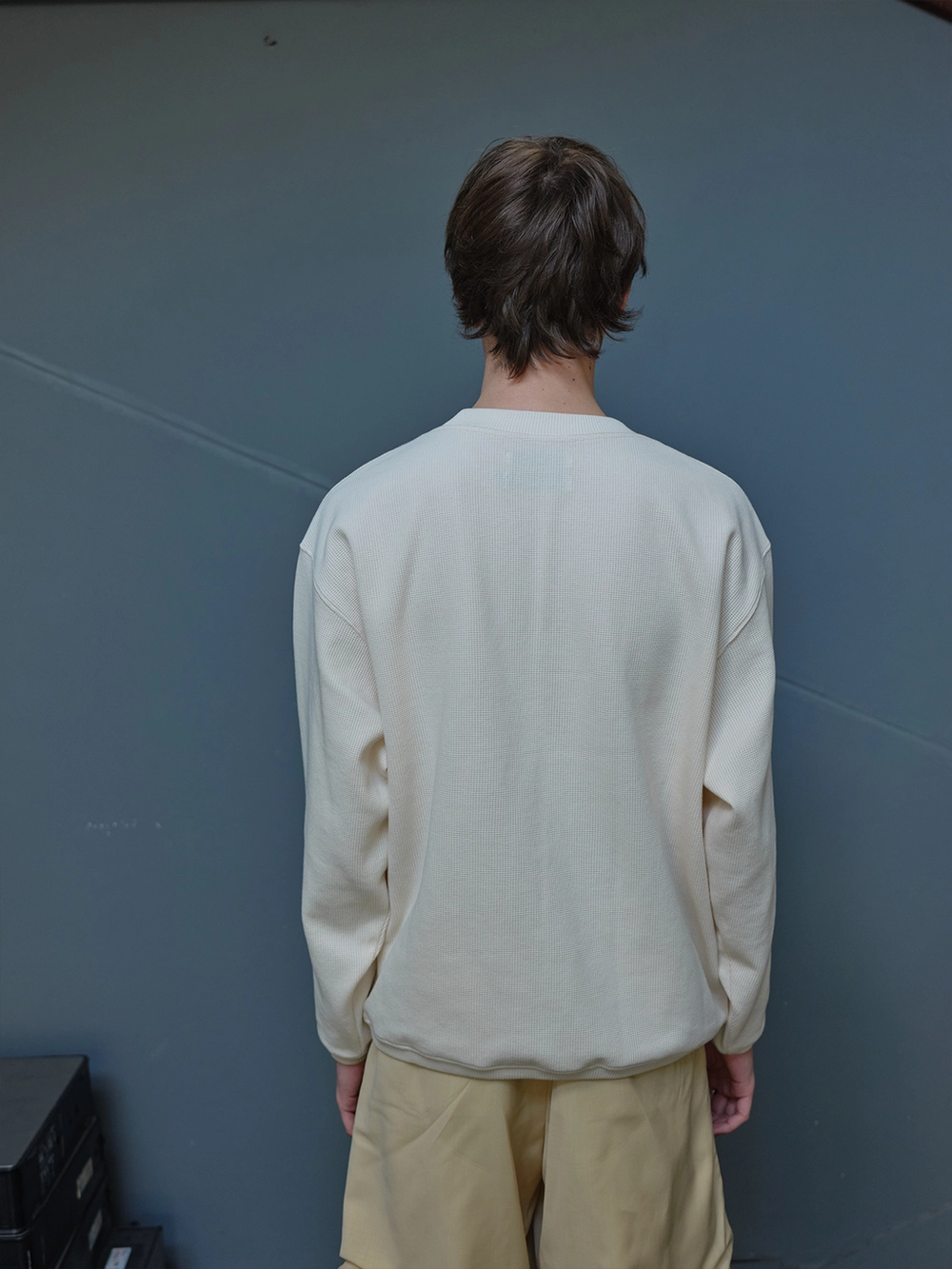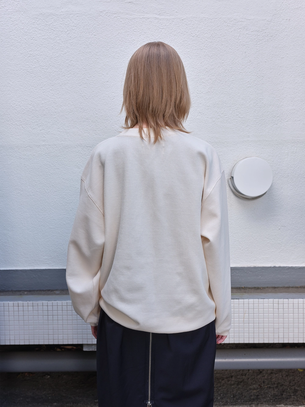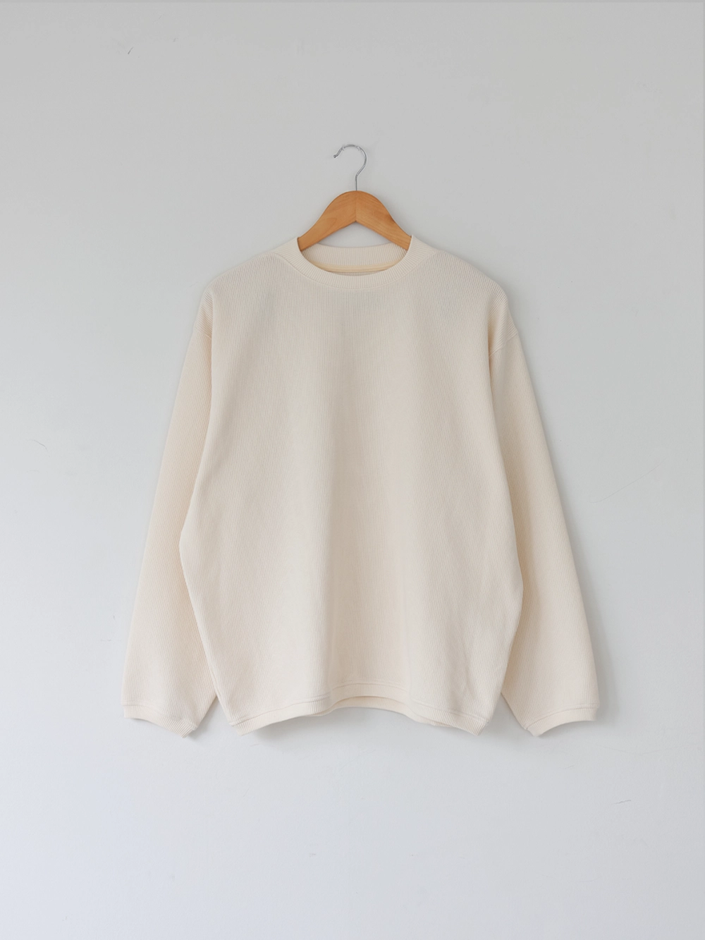 At the heart of the NOT ON EARTH Laboratory is a large training center in the form of a gym. The most striking feature here is the glossy wood floor. The trainers who work in the training center typically wear activewear, but sometimes they opt for a comfortable t-shirt and pants, often going barefoot. People began calling this t-shirt the Floor T-shirt, as it complements the training center’s floor so well. Designed with a slightly shorter length and a wider fit for ease of movement, this t-shirt is made from a structured pattern that gives it a three-dimensional silhouette. Delicate topstitching is applied to all the lines, including the darts on both sides of the back neck and the seams on the sides. It is made from a soft, cool-touch cotton fabric.