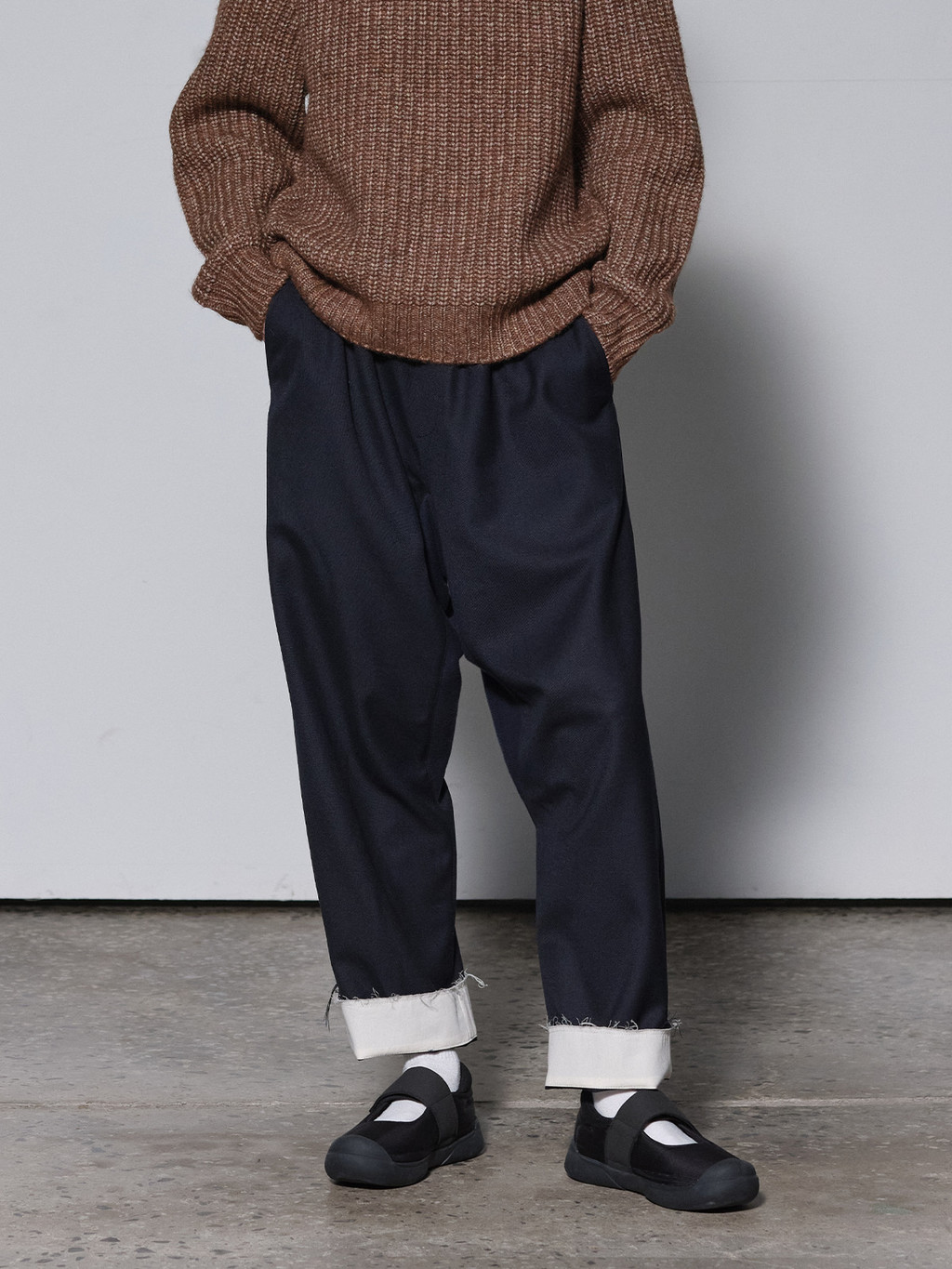 클래식한 울 소재를 여유로운 무드의 밴딩 팬츠 디자인으로 즐길 수 있는 랩 릴렉스드 트라우저입니다. 크로치 부분을 코튼 배색하여 캐주얼한 무드를 살리고 세미 배기 실루엣을 완성하였습니다. 허리 부분은 밴딩 처리되어 착용하기 편안하고 코튼 스트랩으로 길이 조절이 가능합니다. 허리 밴딩 부분이나 뒷면의 스퀘어 포켓, 밑단 등에 컷 오프 디테일로 마감하였습니다. 밑단 부리 부분이 코튼 안감으로 배색되어 있어 턴업하여 다양한 스타일로 연출할 수 있습니다. 가벼운 두께감으로 데일리하게 입기 좋으며 착용할 수록 자연스럽게 풀리는 올이 매력적인 아이템입니다.