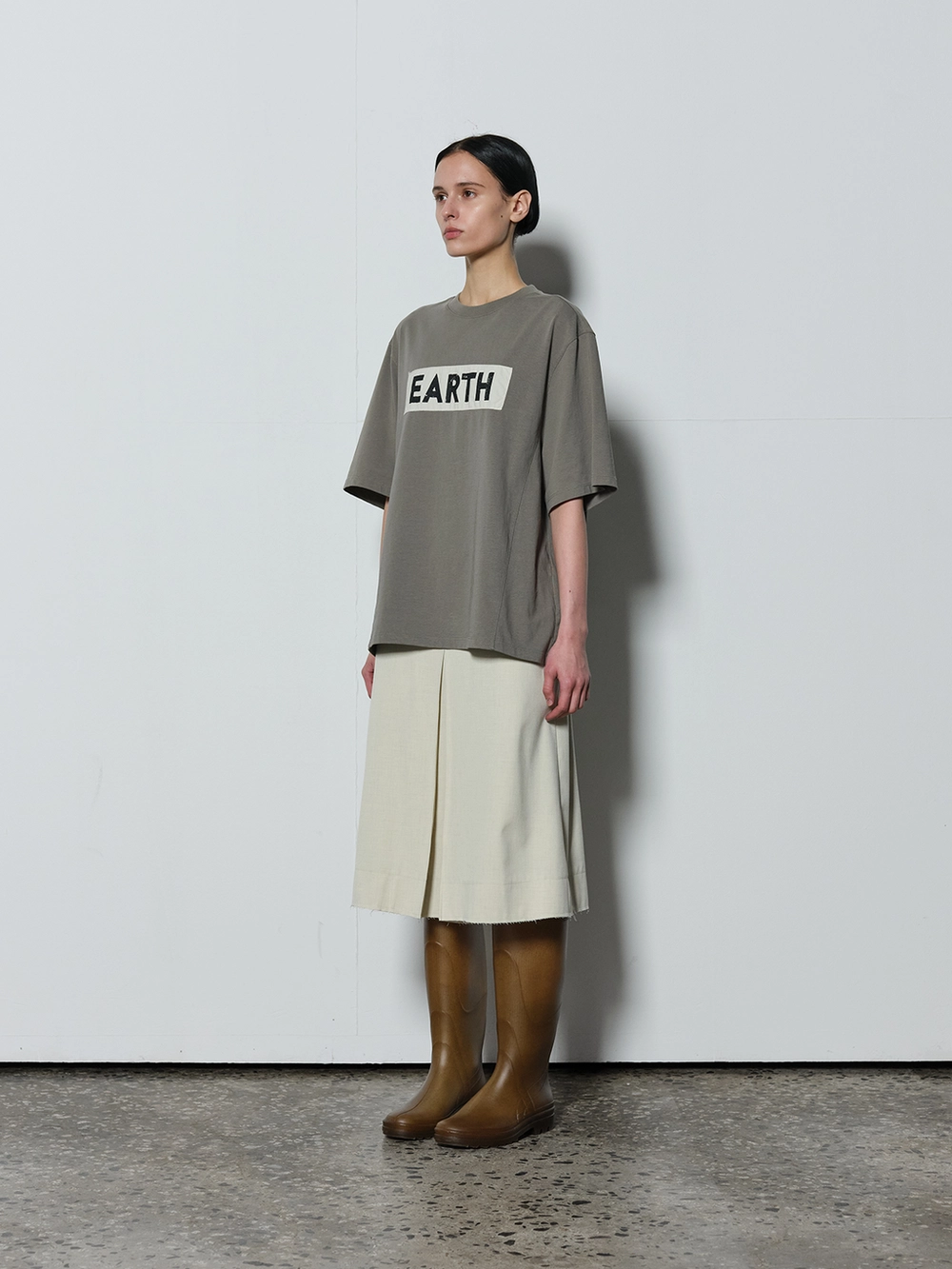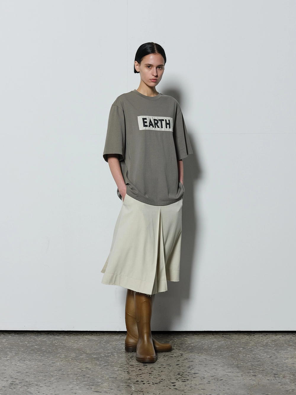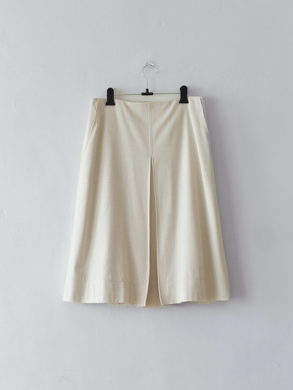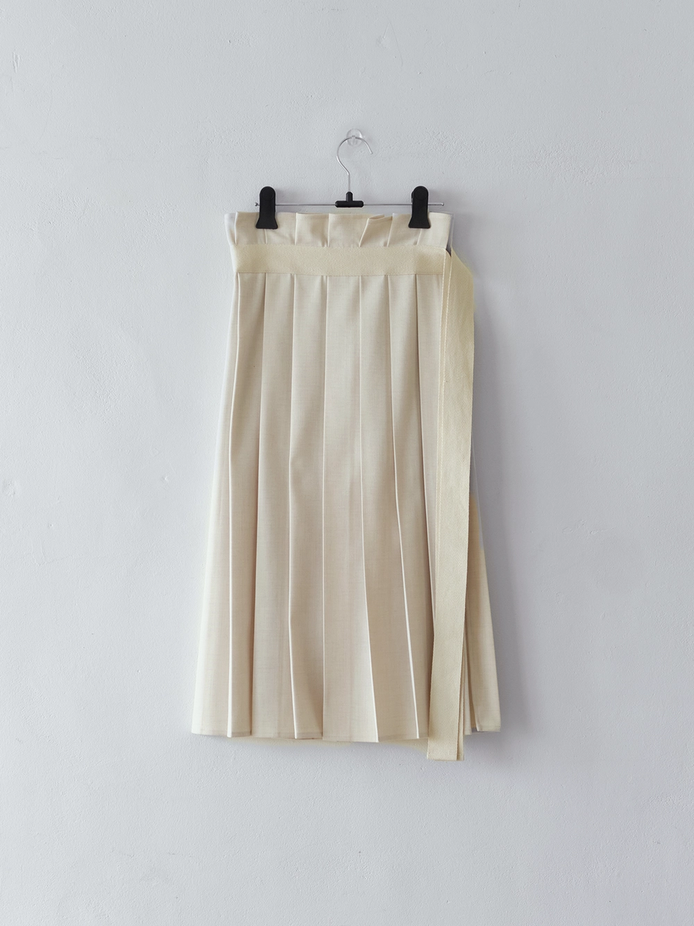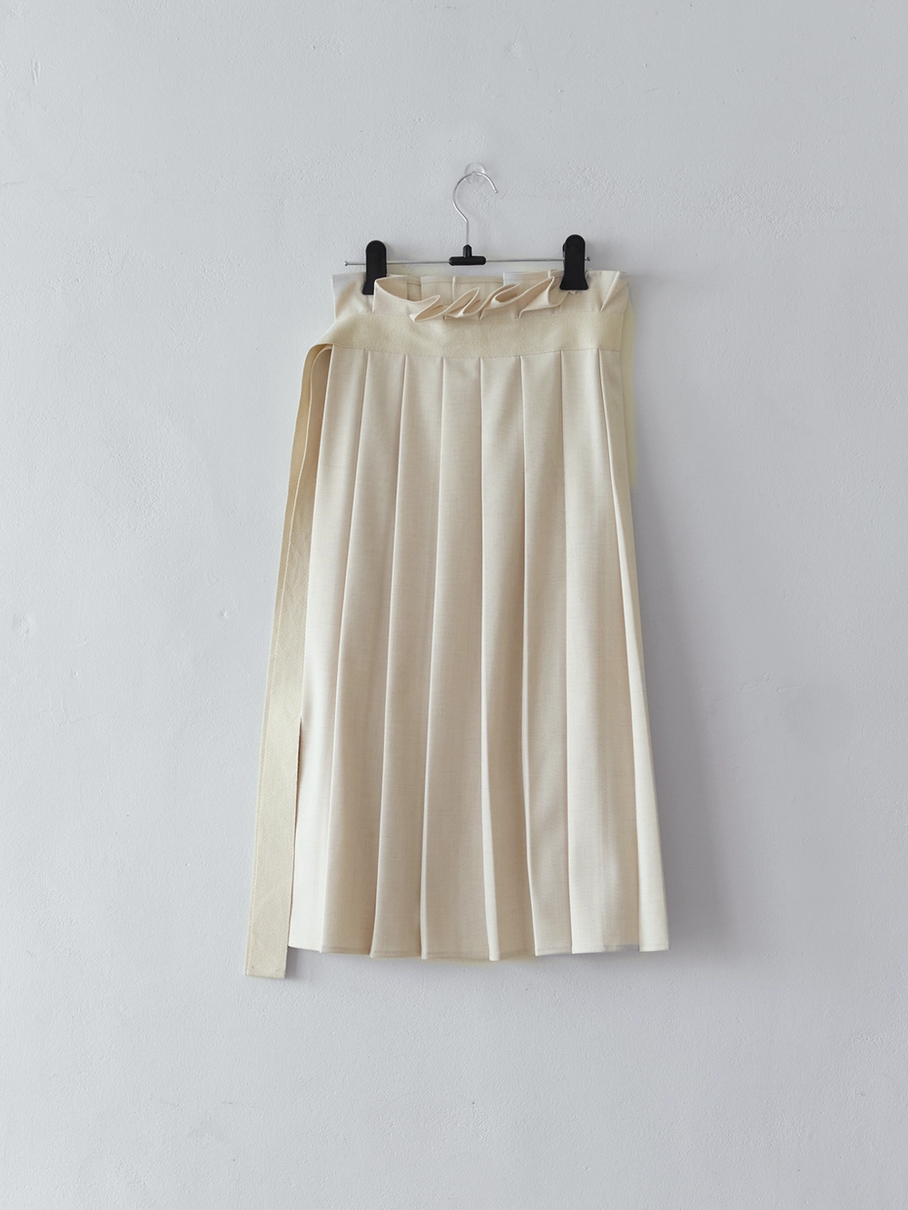 The Agent Pleats Skirt exudes a classic mood. It consists of a semi A-line midi skirt layered with a pleated wrap skirt. The semi A-line midi skirt features a front-center tucker detail and four-panel seams at the back, creating a delicate A-line silhouette. Practical diagonal pockets are placed on both sides of the front, and the hem is finished with a cut-off detail. The pleated wrap skirt, with its clean and classic pleats, is a charming piece that can be layered over various skirts and pants to create a unique look. With its ideal thickness, it can be worn throughout the year.