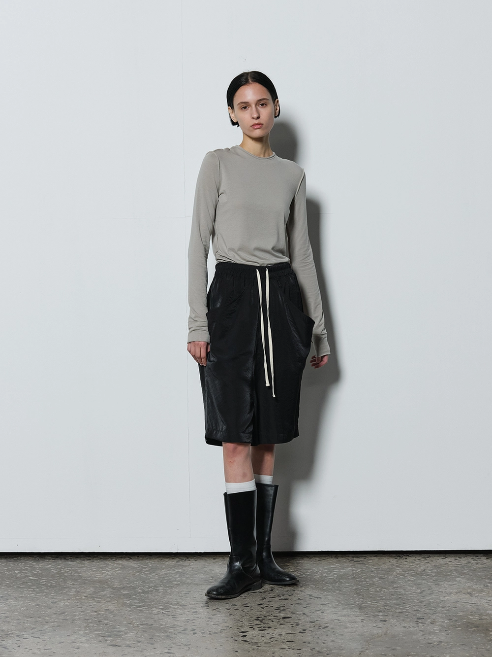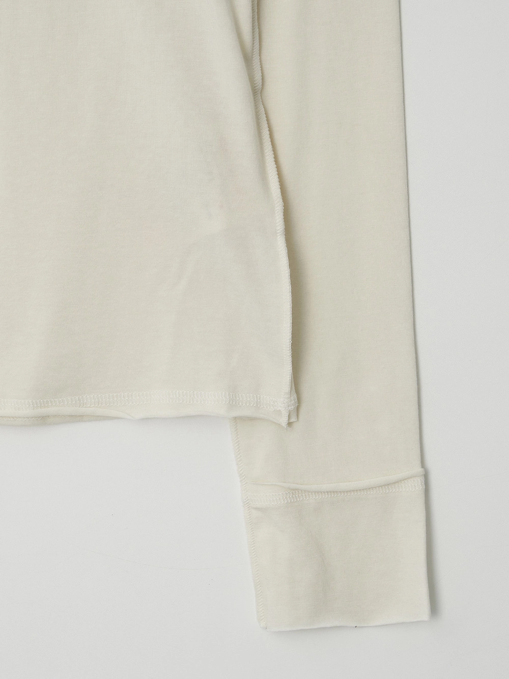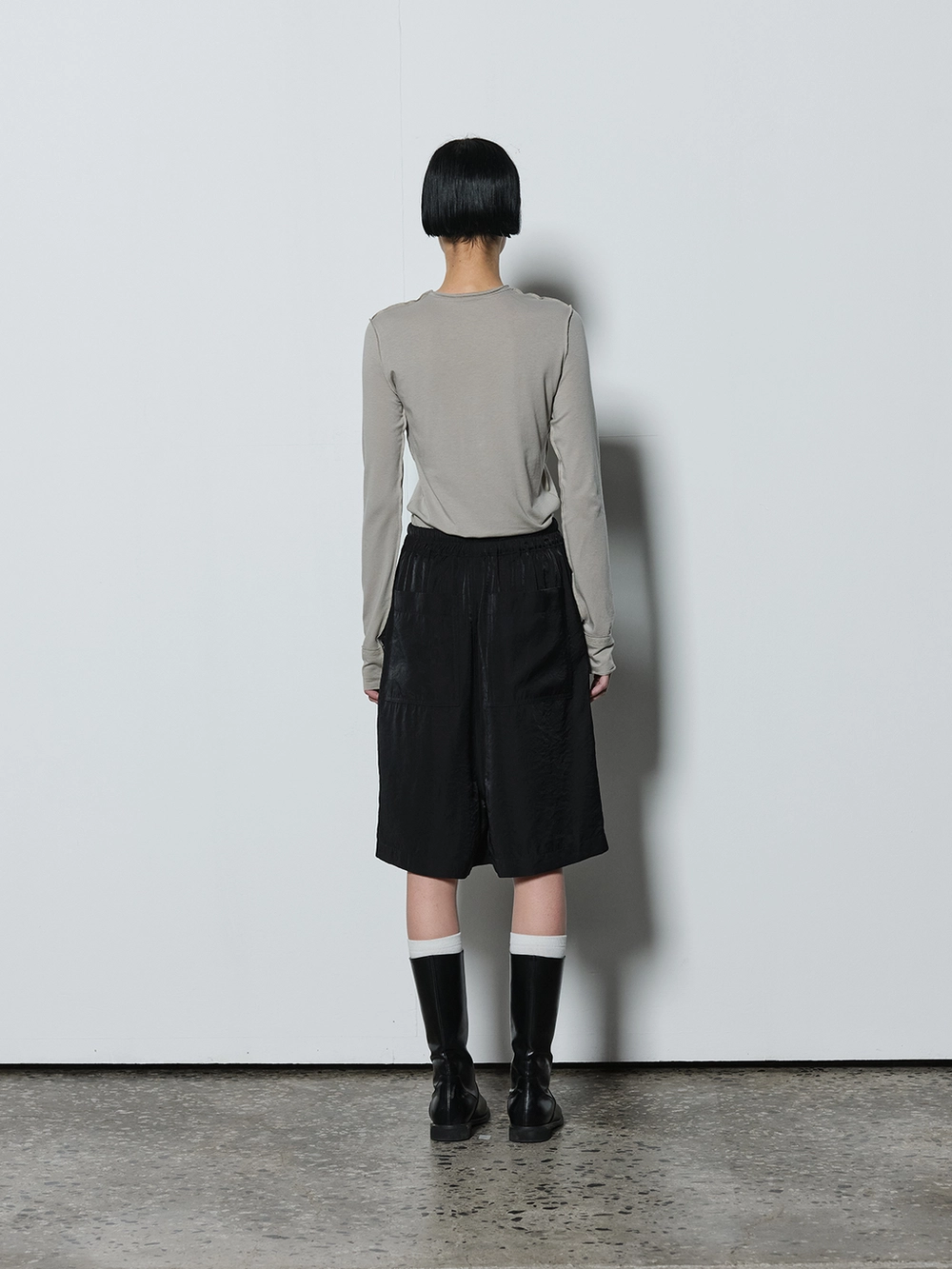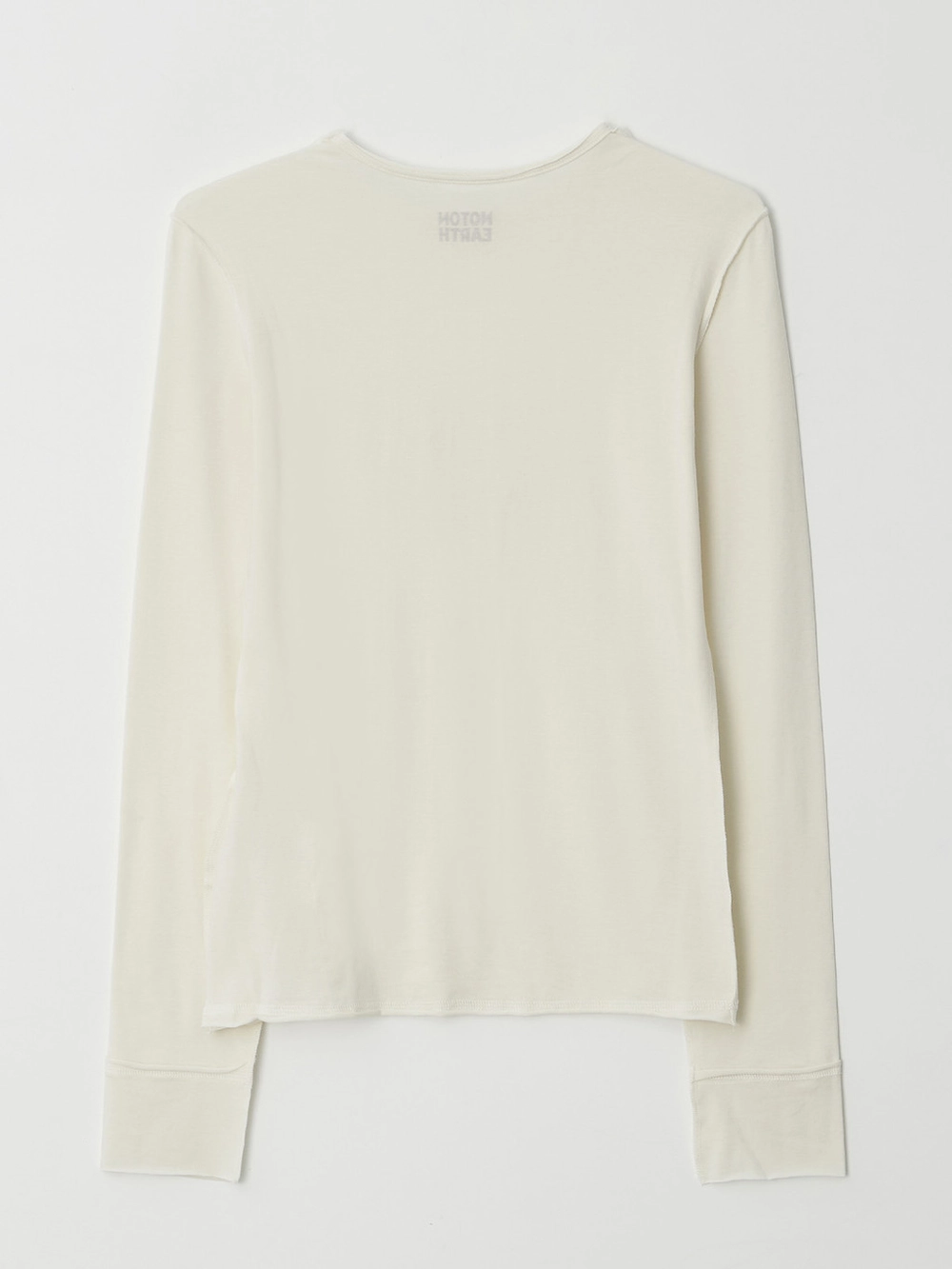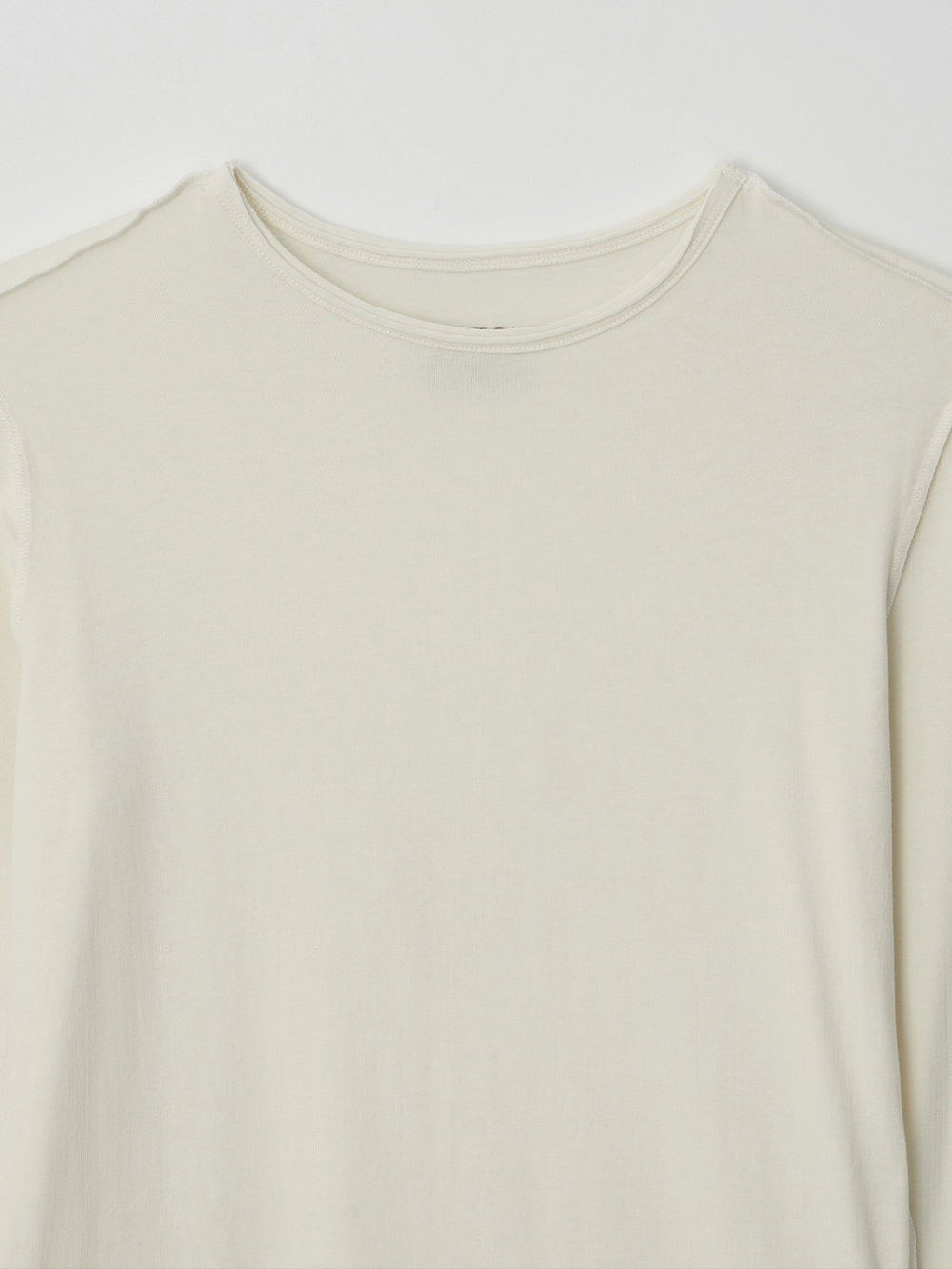 At the heart of the NOT ON EARTH Laboratory is a large training center in the form of a gym. The most striking feature here is the glossy wood floor. The trainers who work in the training center typically wear activewear, but sometimes they opt for a comfortable t-shirt and pants, often going barefoot. People began calling this t-shirt the Floor T-shirt, as it complements the training center’s floor so well. Designed with a slightly shorter length and a wider fit for ease of movement, this t-shirt is made from a structured pattern that gives it a three-dimensional silhouette. Delicate topstitching is applied to all the lines, including the darts on both sides of the back neck and the seams on the sides. It is made from a soft, cool-touch cotton fabric.