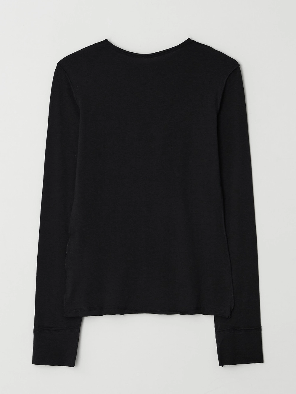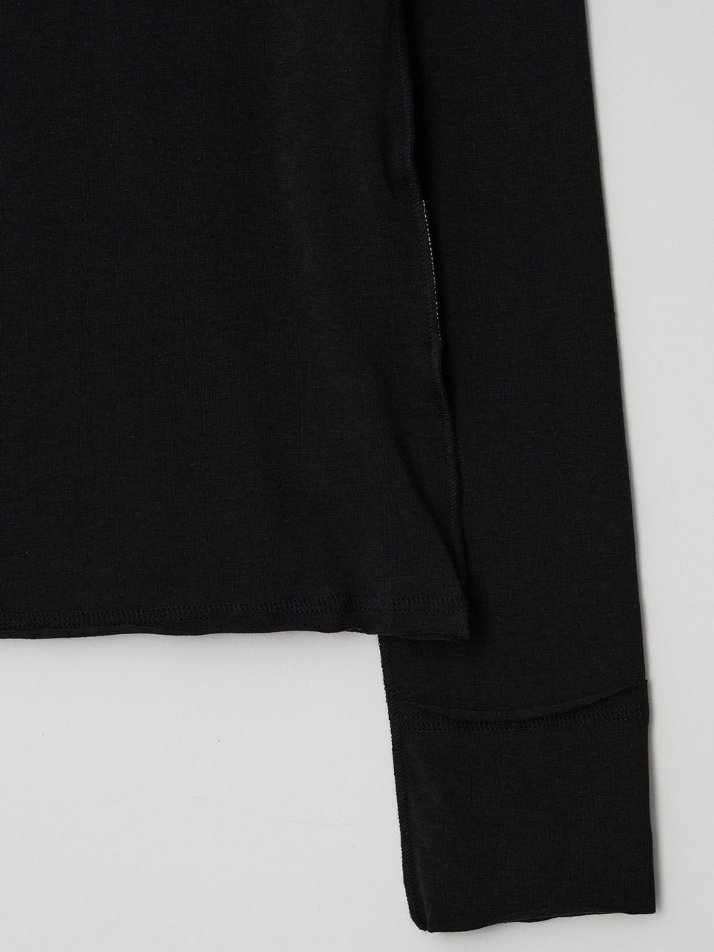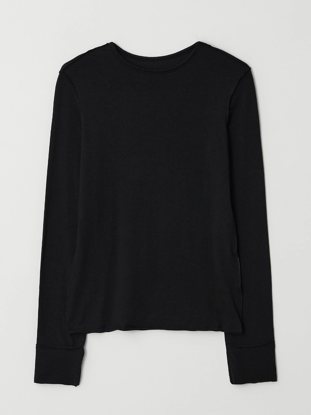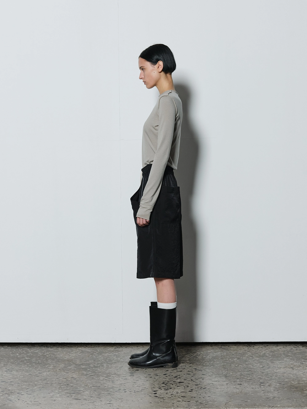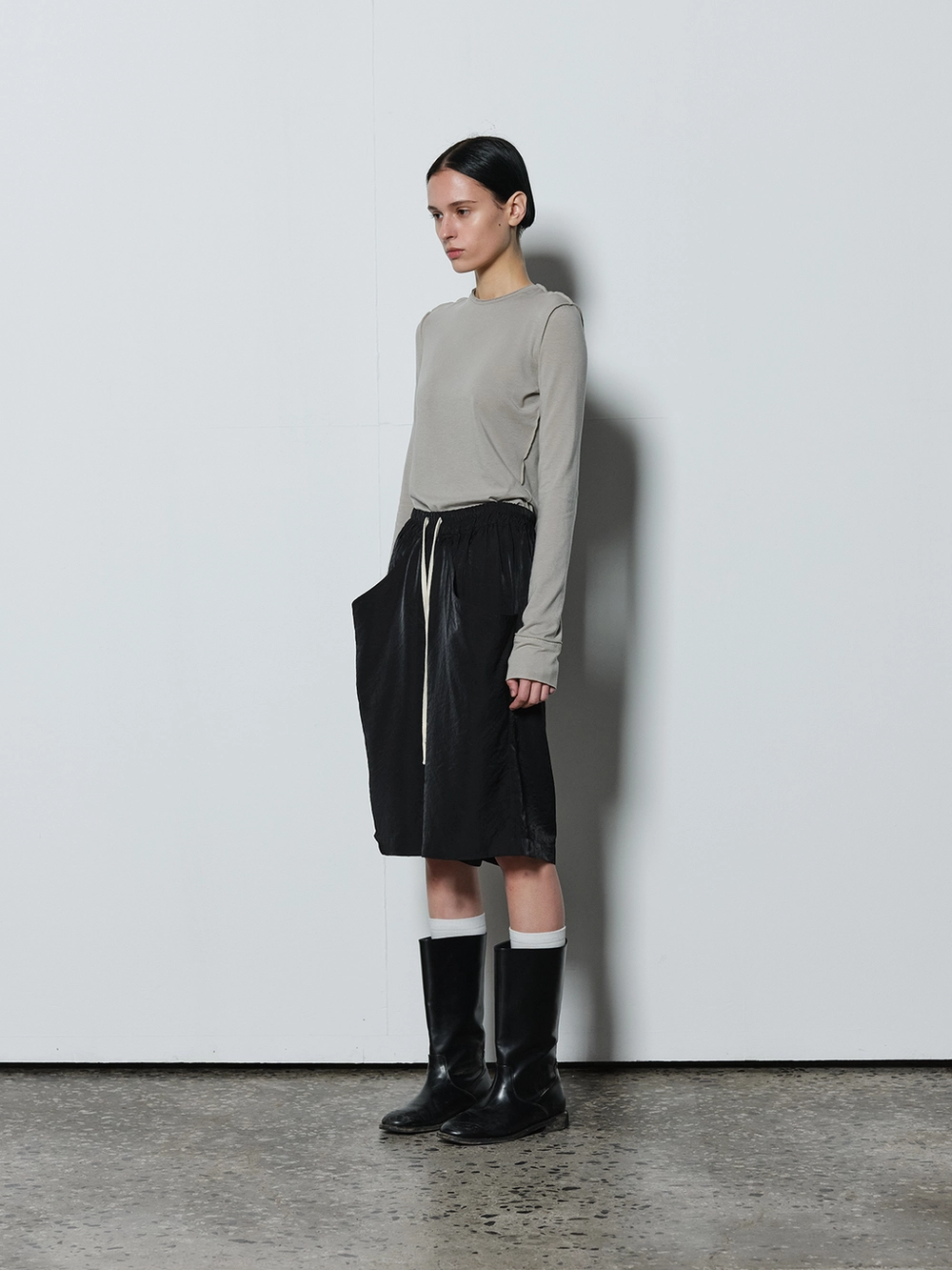 At the heart of the NOT ON EARTH Laboratory is a large training center in the form of a gym. The most striking feature here is the glossy wood floor. The trainers who work in the training center typically wear activewear, but sometimes they opt for a comfortable t-shirt and pants, often going barefoot. People began calling this t-shirt the Floor T-shirt, as it complements the training center’s floor so well. Designed with a slightly shorter length and a wider fit for ease of movement, this t-shirt is made from a structured pattern that gives it a three-dimensional silhouette. Delicate topstitching is applied to all the lines, including the darts on both sides of the back neck and the seams on the sides. It is made from a soft, cool-touch cotton fabric.